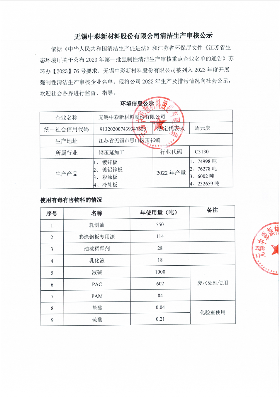 無錫中彩新材料股份有限公司清潔生產(chǎn)審核公示